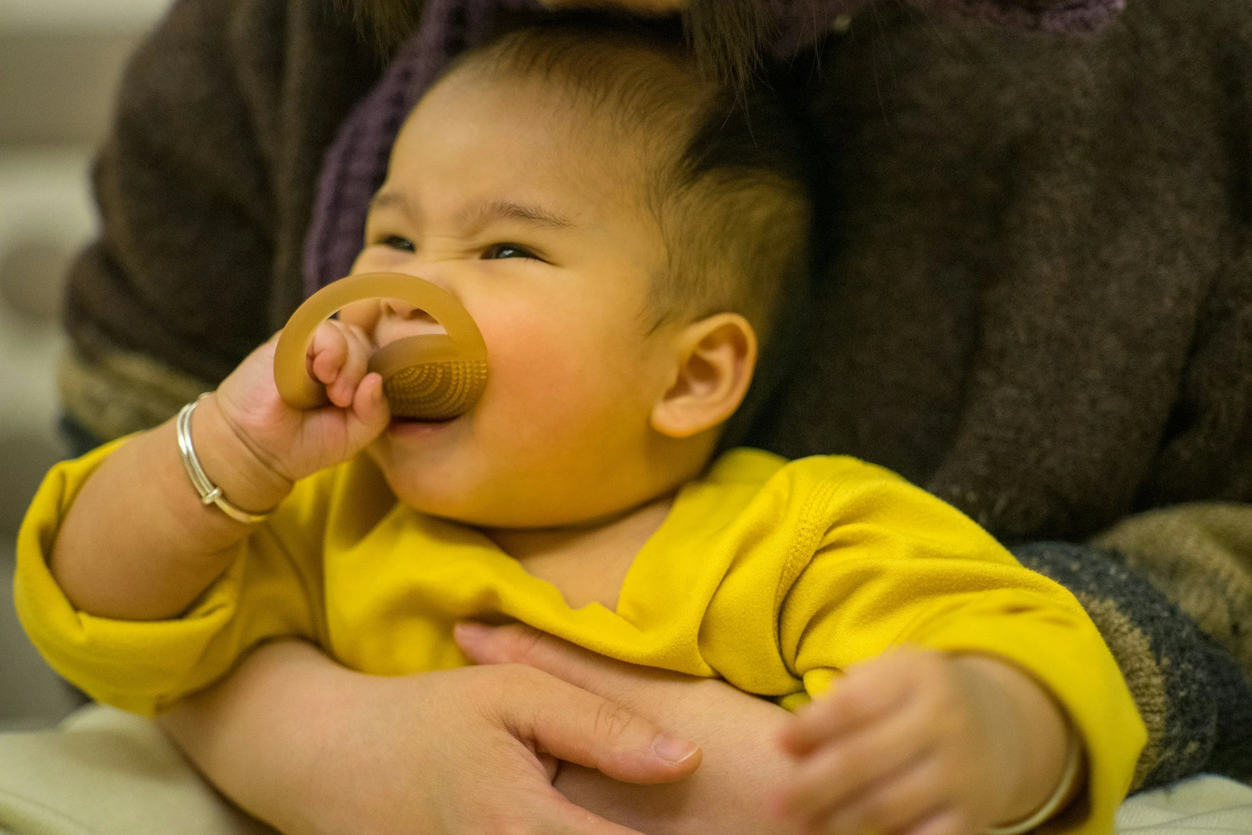 Teething is a long span of a child’s first few years. It typically begins around 4-8 months and lasts until 2-3 years old. It happens in spurts, with many parents reporting a difference in behavior due to the physical pain and discomfort their child exhibits during acute teething. That discomfort comes in the forms of red cheeks, swollen gums, excessive drooling, and sometimes even diarrhea leading up to the eruption of a tooth. This then leads to behavioral changes causing more whining, crying, and interrupted sleep.